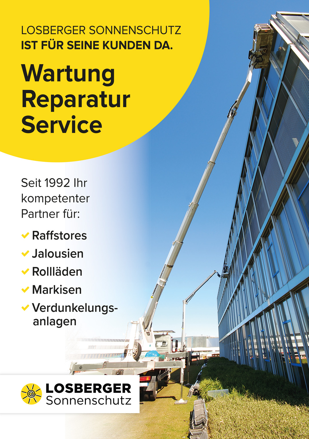 Wir von LOSBERGER Sonnenschutz setzen auf Nachhaltigkeit. Darum zeichnen unsere Produkte ein unbedingter Anspruch an Qualität und Langlebigkeit aus. Trotzdem altern alle Produkte, die der Sonne, Wind und Wetter ausgesetzt sind. Mit unseren Serviceangeboten geben wir unseren Produkten ein neues Leben: